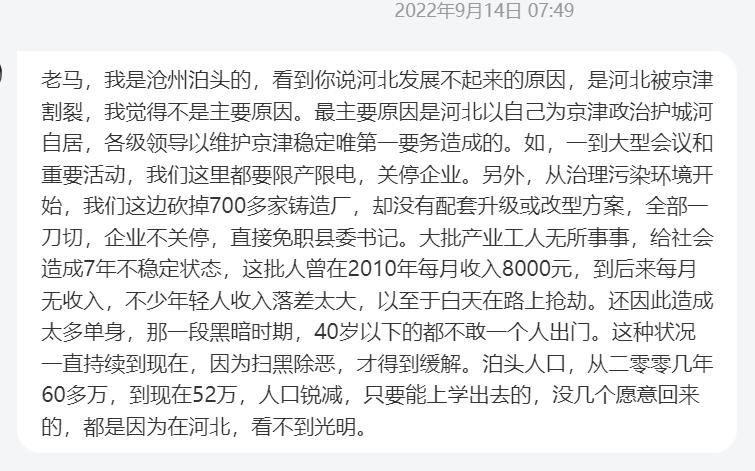 @刘海组:终于到我的“专业领域”了,在河北张家口和沧州都生活过较长时间,也跑过承德,石家庄,秦皇岛,勉强算是对河北有个比较全面的认识。在老家张家口本地人总认为是北京拖慢了整个地区的发展速度,因为严格的环保政策导致没有跟上上个世纪的工业化经济红利,另一方面北京严重影响着整个河北的交通,以至于几年前其他地区去承德最好的办法还是借道北京。(前些年才算是有了张承高速,虽然冬天经常被天气原因影响)