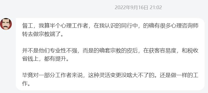 @Hodor 丿:唉,啥时候管管农村的这些宗教,佛教道教封建迷信教,我也说不清是啥教,因为他可能即信太上老君又信如来佛还夹杂各种地方神,可能更多是封建迷信偏多吧,我姥姥就天天去参加,花钱不说还挺像家庭关系,同时他们也不单纯搞宗教,还搞传销,卖营养品洗护用品,我就被姥姥苦口婆心劝说买了什么香皂,劝了也不听,宗教加持下给老年人卖保健品兼职事半功倍,农村地区真的改管管了,我也不知道宗教局知不知道这些情况