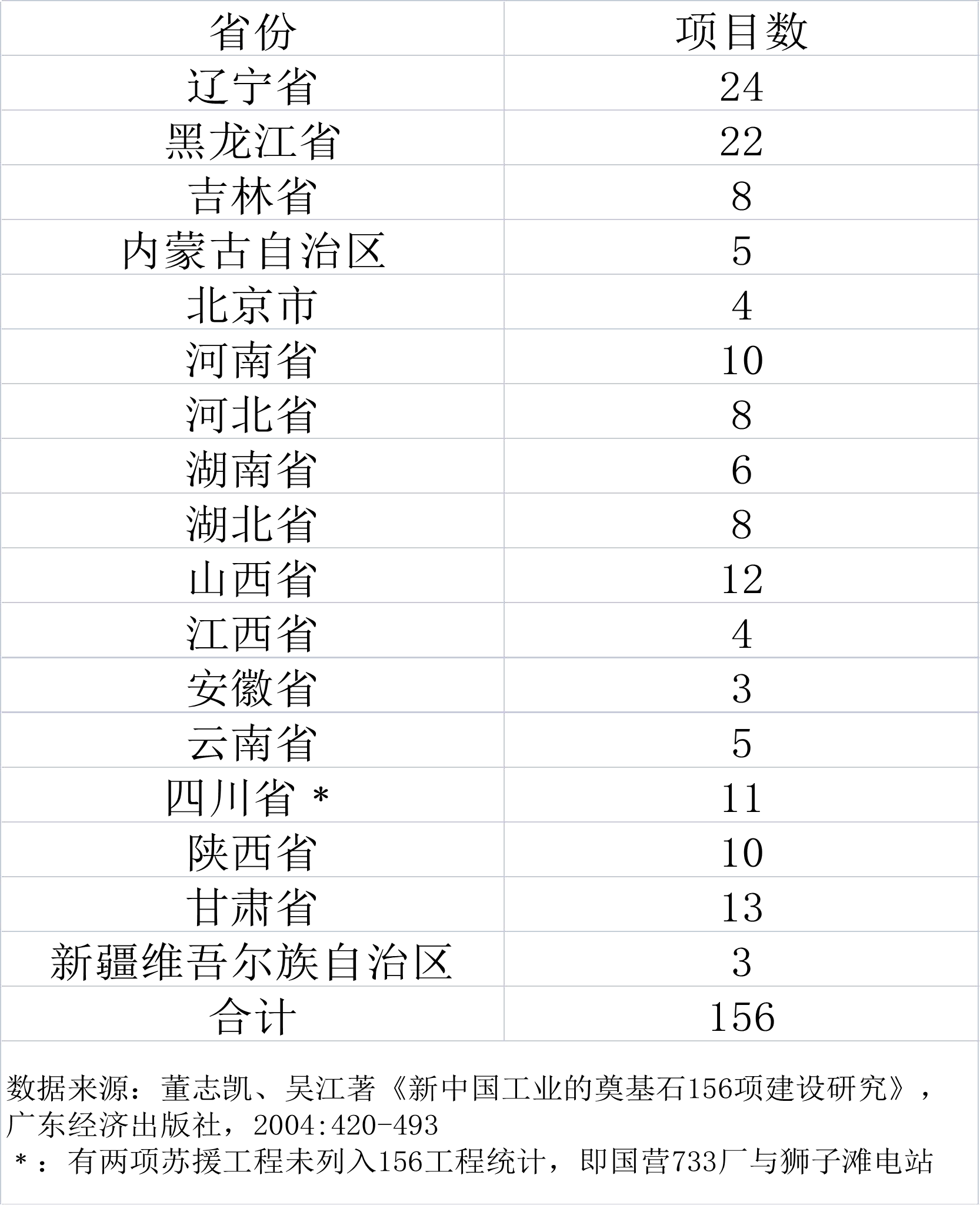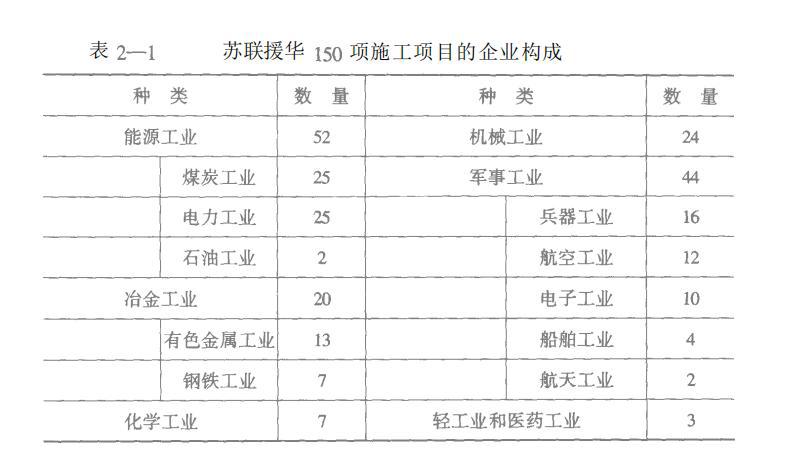 资料来源:《苏联技术向中国的转移 1949-1966》,山东教育出版社,2004:75。由于 1958-1960中苏关系恶化与工期等主客观原因,实际完成 150 项。其中 4 项(第二汽车制造厂、第二拖拉机制造厂、山西潞安一号立井、山西大同白土窑立井)因为选址争议,2 项则因为陕西 422厂统计了两次,造成两项重复计算。